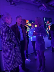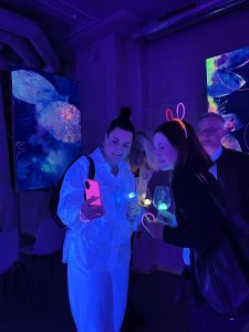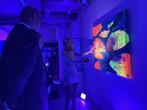 Zwischen leuchtenden Bildwelten im Schwarzlicht und den sphärischen Sounds von Gene Pritsker entstand eine eindrucksvolle, immersive Atmosphäre. Der Dresscode „Gallery in the Dark“ machte die Gäste selbst zum Teil der Inszenierung: Ganz in Weiß gekleidet und mit Neonakzenten versehen, verschmolzen sie mit der Kunst zu einem lebendigen Gesamterlebnis.